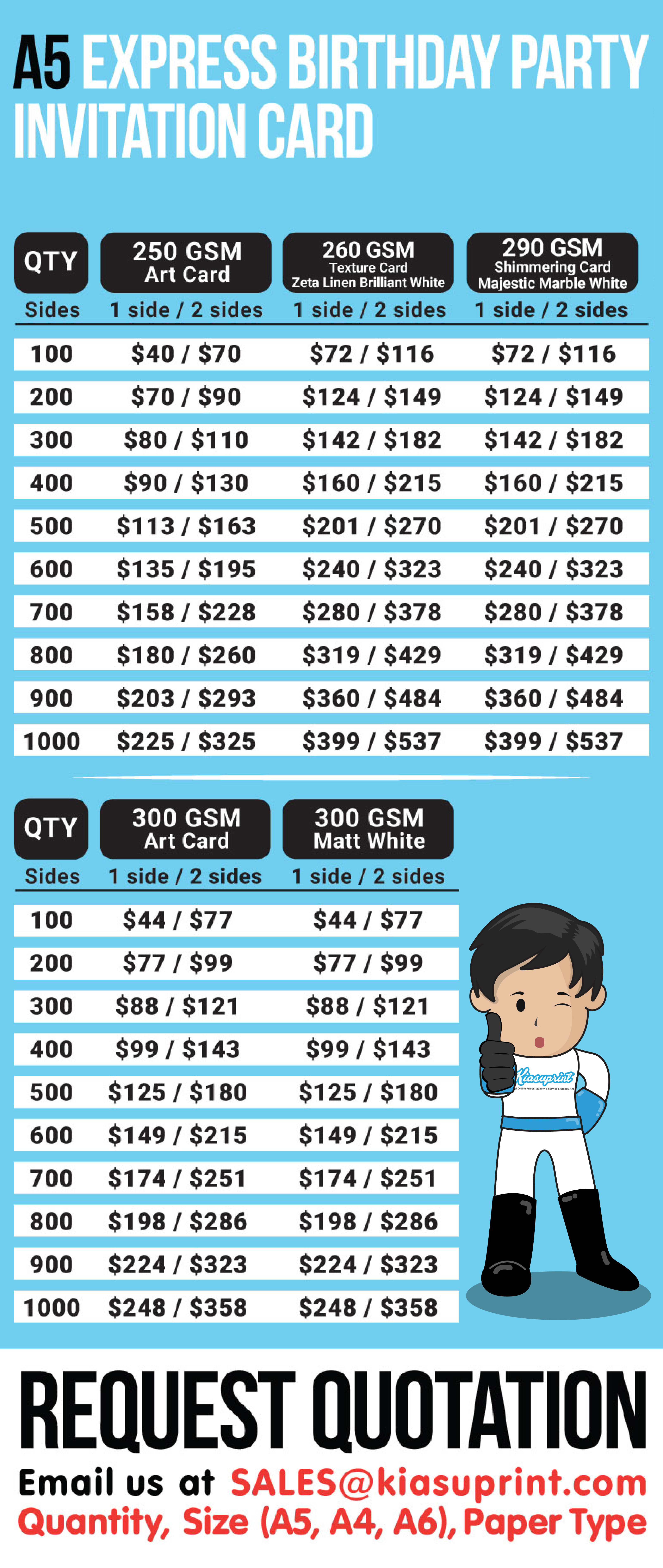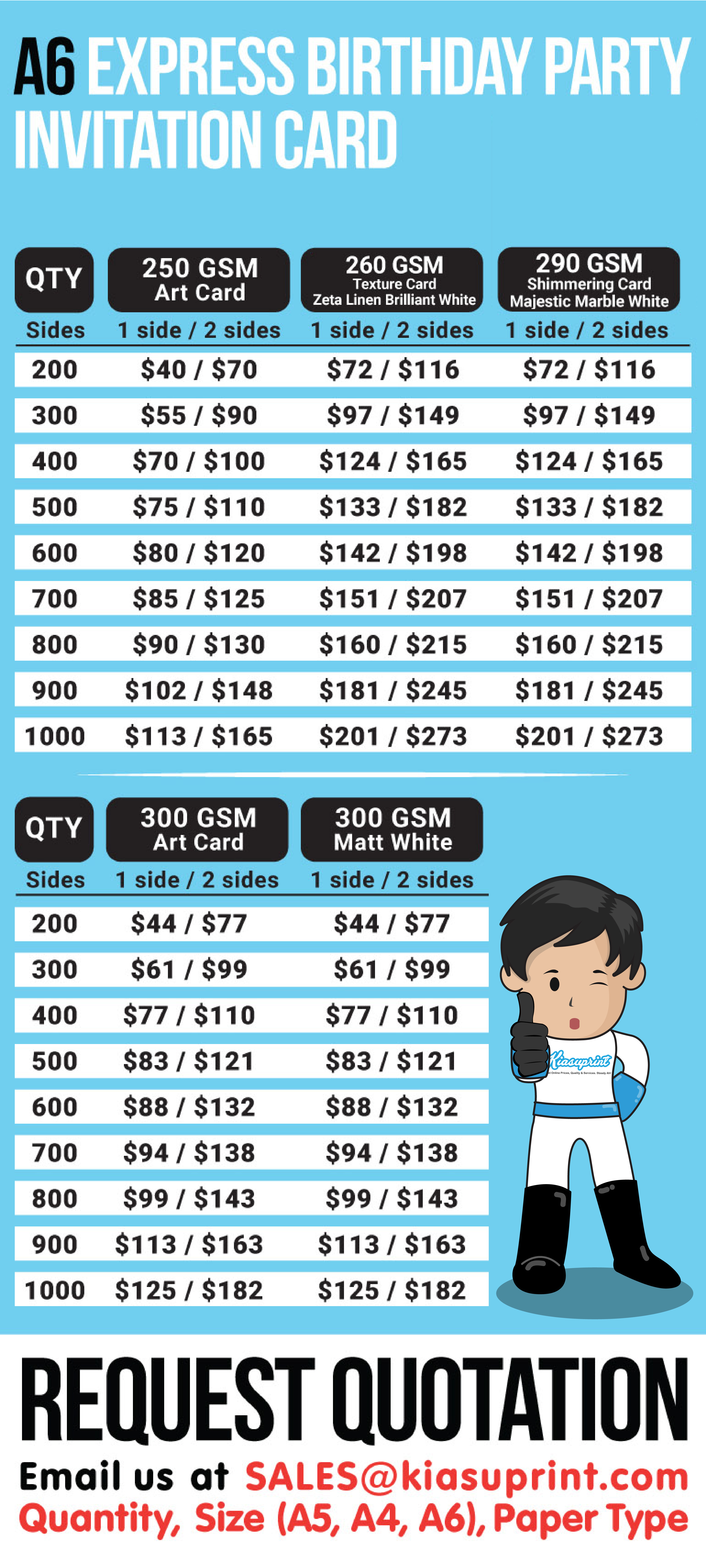Design and print invitation cards to your birthday party to match your theme. Sending invitations with a personalised message to family and friends alike, will make them feel valued and add that meaningful touch to enhance your relationships. Besides, what better way to throw the perfect party than to weave your theme into the invitation card, giving guests a preview of what’s to come! Let your personality shine through in the card, it’s your big day after all. With us, your party budget won’t even flinch due to our highly affordable prices and quality ensured!