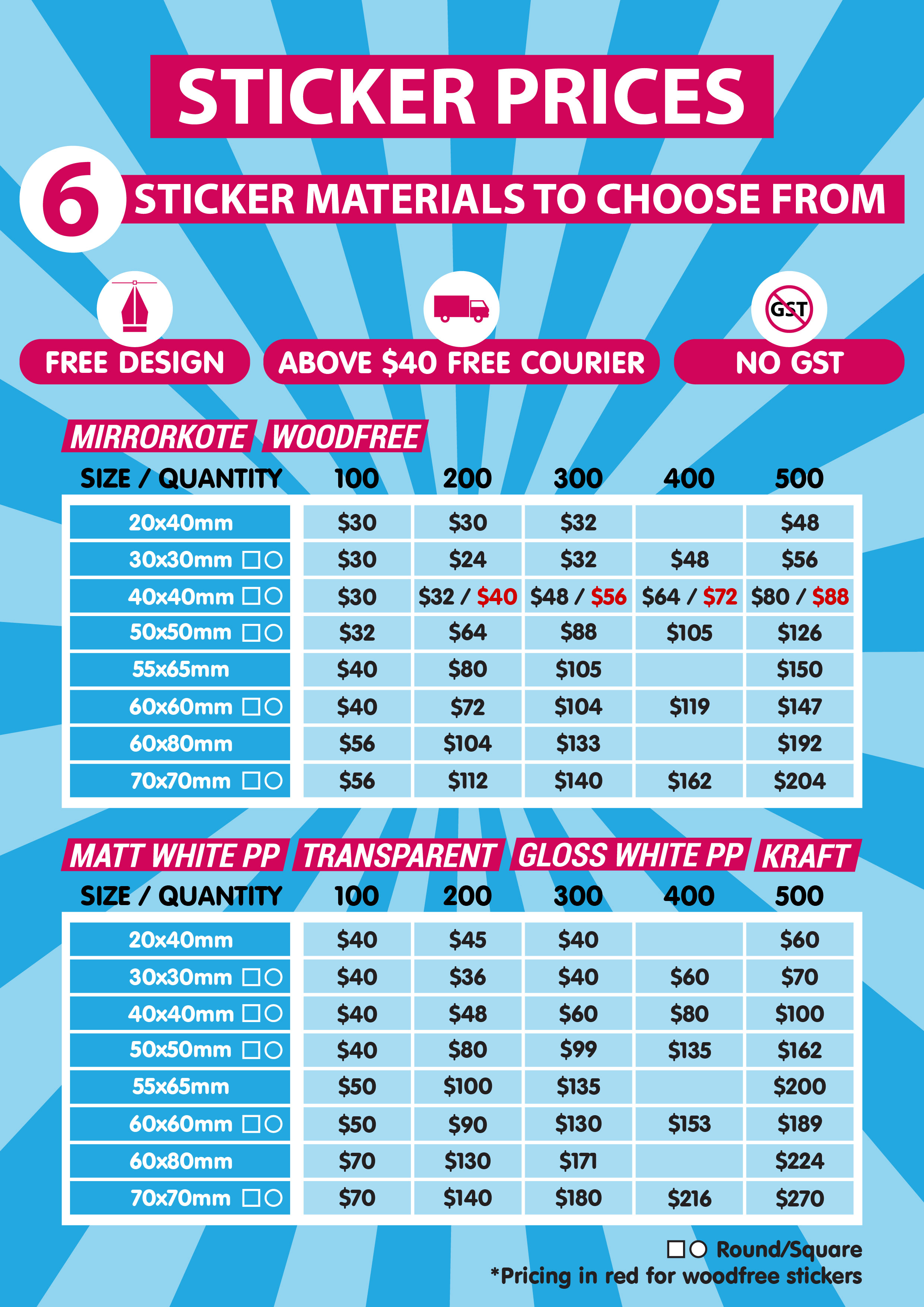 Please email at sales@kiasuprint.com or Whatsapp us with +65 81820938 the size, quantity, and sticker materials as below.